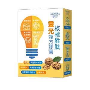 核桃胜肽靈光複方膠囊 匯集磷脂醯絲氨酸、綠薄荷、葡萄、藍莓、 核桃胜肽、蘆筍、猴頭菇菌絲體、米胚芽(含GABA)、γ-穀維素、天麻等等提供多重的營養補給,幫助調節生理機能,持續補充更有助於健康維持和調整體質。