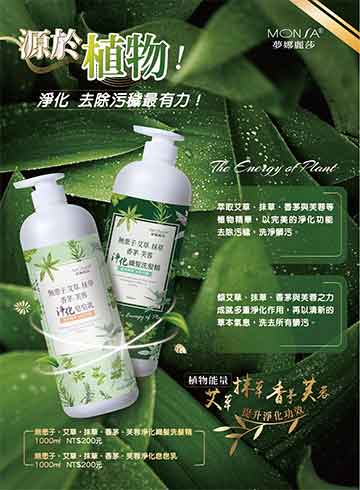 源於植物!淨化去除污穢最有力!植物能量艾草、抹草、香茅、芙蓉提升淨化功效萃取艾草、抹草、香茅與芙蓉等植物精華,以完美的淨化功能去除污穢,洗淨髒污。