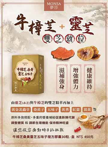 產品說明:牛樟芝+靈芝雙芝就位! 滋補強身、增強體力、健康維持