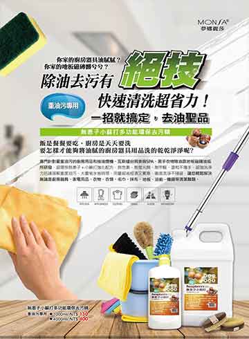 你家的廚房器具油膩膩?你家的地板磁磚髒兮兮?除油去污有「絕技」快速清洗超省力!一招就搞定,去油聖品無患子小蘇打多功能環保去污精飯是餐餐要吃,廚房是天天要洗,要怎樣才能夠將油膩的廚房器具用品洗的乾乾淨淨呢?專門針對嚴重油污的廚房用品和抽油煙機、瓦斯爐台與美容SPA、黑手衣物除油跟地板磁磚油垢所研發,超環保無患子+小蘇打強化配方,無色素、無螢光劑、無甲醛、溫和不傷手、超強洗淨力迅速溶解重度油污、大量省水省時間、用量超省經濟又實惠、徹底洗淨不殘留,讓您輕鬆解決無論是廚房器具、家電用品、地板、浴廁、衣物、衣領、毛巾、抹布、機器等清潔難題。超強洗淨力,能快速溶解重度油污,天然無患子+小蘇打強化配方,不汙染超環保,好沖、好洗、不殘留。
