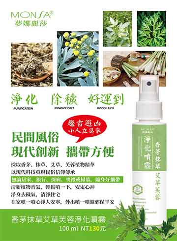 淨化 除穢 好運到!民間風俗現代創新攜帶方便採取香茅、抹草、艾草、芙蓉植物精華以現代科技重現民俗信仰傳承,無論居家、旅行、探病、喪禮或掃墓,隨身好攜帶。清新植物香氣,輕鬆噴一下,安定心神,淨化去穢氣,清淨住宅。在家噴一噴心淨人安寧,外出噴一噴避邪保平安。