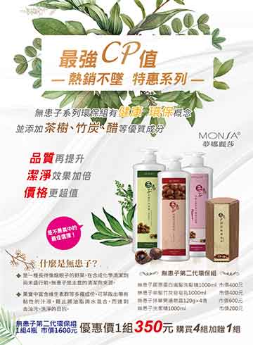 無患子系列環保組有健康,環保概念,並添加茶樹、竹炭及醋等優質成分,品質再提升、潔淨效果加倍、價格更超值!是不景氣中的最佳選擇!