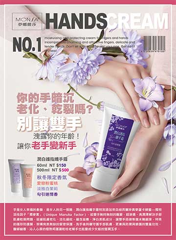 手是女人幸福的象徵,是女人的另一張臉,潤白護指纖手霜特別添加來自紐西蘭珍貴麥蘆卡蜂蜜—獨特活性因子「獨麥素」(Unique Manuka Factor),給雙手無時無刻的寵愛,超滲透、高潤澤解決手部肌膚乾燥問題,延緩肌膚老化、淡化細紋。 蘊含滋養、淨白美肌成分,讓雙手迅速恢復水嫩細滑,特殊的隱形防護膜,架構完美無缺的緊密保護,洗手後持續守護手部肌膚,更兼具防禦與修護的雙重功效。馥郁幽香、沁人心扉的極致呵護讓乾枯老婦手也能變成少女般的瑩潤玉手。