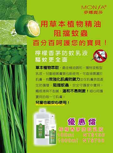 用草本植物精油,阻擋蚊蟲百分百呵護您的寶貝!檸檬香茅防蚊乳液驅蚊更全面草本植物萃取,最佳精油調和,獨特液態型乳液,兒童細嫩膚質也能使用,可直接噴灑於肌膚,有效強化肌膚防禦力並在肌膚表面產生防護層,阻擋蚊蟲,安全守護家中寶貝,觸感清爽不黏膩,溫和不易刺激!細心呵護寶貝的每一寸肌膚!兒童也能安心使用!
